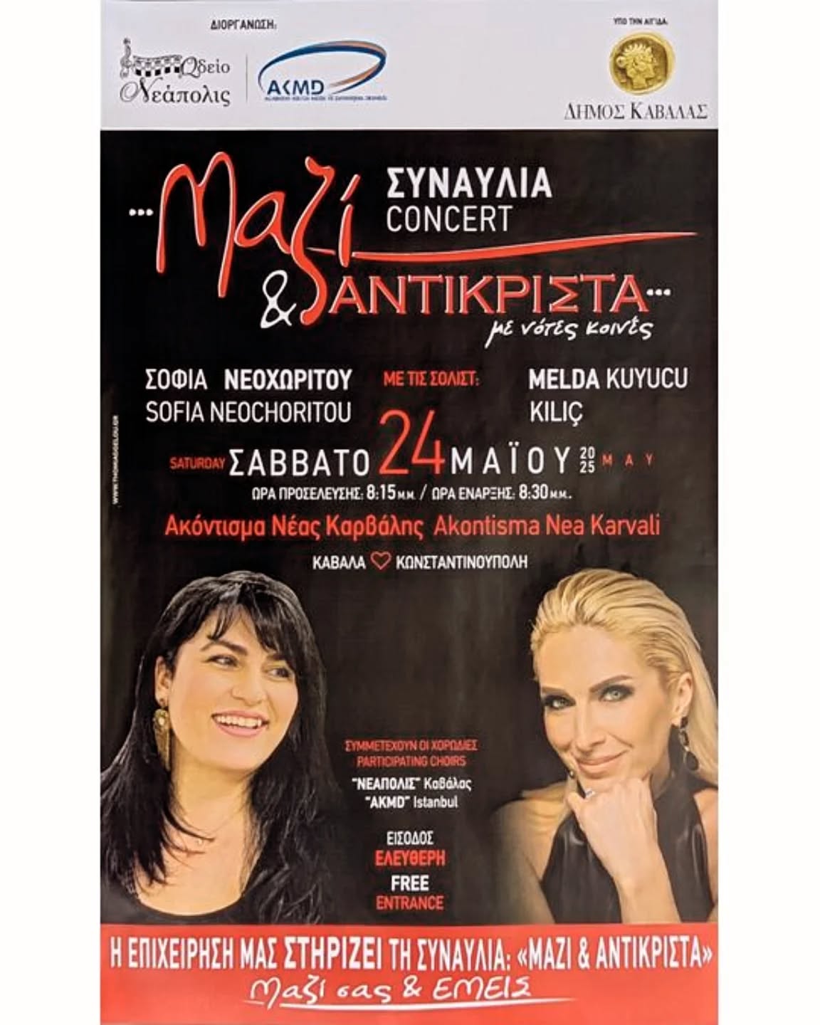 Με μεγάλη χαρά στηρίζουμε τη συναυλία "Μαζί & Αντικριστά"Ένα μουσικό γεγονός που ενώνει κουλτούρες, ψυχές και φωνές από Ελλάδα και Τουρκία! Το Σάββατο 24 Μαΐου, σας περιμένουμε στο Ακόντισμα Νέας Καρβάλης, για μια μαγευτική βραδιά με τη Σοφία Νεοχωρίτου και τη Melda Kuyucu Kılıç.Ας ζήσουμε μαζί την μαγεία της μουσικής!Η επιχείρησή μας είναι...