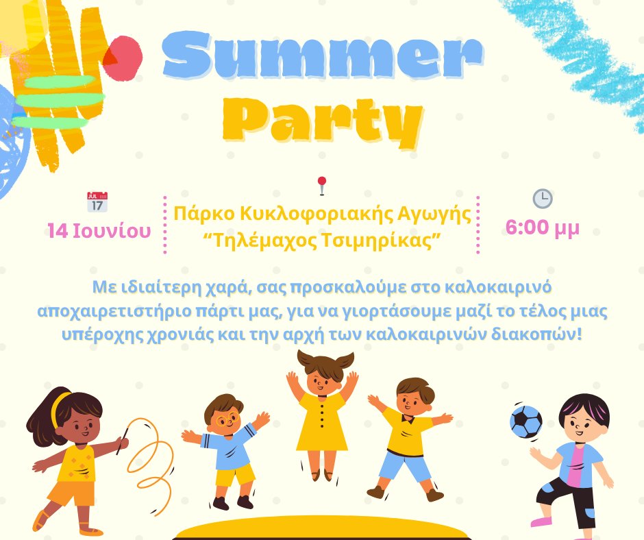 Η σχολική χρονιά φτάνει στο τέλος της και ήρθε η ώρα για λίγη… καλοκαιρινή χαλάρωση! Σας περιμένουμε το Σάββατο 14 Ιουνίου στις 6:00 μ.μ. στο Πάρκο Κυκλοφοριακής Αγωγής "Τηλέμαχος Τσιμηρίκας" (Νεάπολη-ΔΕΠΟΣ) για να γιορτάσουμε όλοι μαζί με ένα χαρούμενο καλοκαιρινό πάρτι! Εκεί, θα δοθούν οι έλεγχοι προόδου και τα απολυτήρια των μαθητών!Παιχνίδι,...
